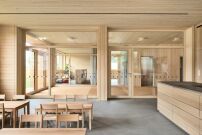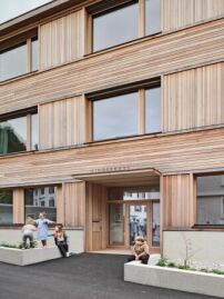 Die Vorarlberger Gemeinde Wolfurt liegt kleinteilig zerklüftet am Fuß einer Bergkette. Traditionelle Hausformen und Materialien prägen das Ortsbild, der Einsatz von Holz – ob als Schindel, Tragstruktur oder Innenbekleidung – gehört hier fast schon zum guten Ton. Vor diesem Hintergrund haben bernardo bader architekten (Bregenz) im historischen Ortsteil Rickenbach ein neues Kinderhaus realisiert, das im September in Betrieb ging. Es bietet Platz für sechs Gruppen.