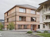 Innen setzt sich die starke Präsenz des Holzes konsequent fort: Weißtanne an den Wänden, Lärche unter den Füßen. Insgesamt 420 Kubikmeter Holz kamen zum Einsatz. Die Konstruktion ist hybrid organisiert – Untergeschoss und Erschließungskern massiv, die übrigen Bereiche in Massivholz. Die Materialität sorgt für atmosphärische Wärme. Bauherrschaft war die Marktgemeinde Wolfurt.