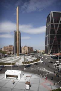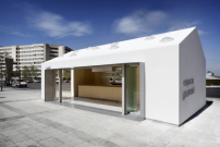 Die Architekten kennen ihr Viertel gut: Seit Jahren arbeiten und leben Alberto García und Ramiro Losada, die zusammen als LG arquitectos auftreten, in Tetuán, einem nördlichen Stadtteil von Madrid. Dort, am Fuß der markanten, schräg einander zugeneigten Zwillingshochhäuser, die gerne eingeblendet werden, wenn über Spaniens Wirtschaftskrise berichtet wird, haben sie einen frechen, kleinen kiosco, einen Treffpunkt mit Bar gebaut.