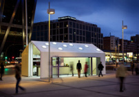 Der gesamte Kiosk wurde aus vorfabrizierten Bauteilen zusammengesetzt. Die Fassade haben die Architekten mit weißem Mörtel behandelt, innen sind die Wände mit Eschenholz verkleidet. In seiner Einfachheit und auch durch seine Lage an dem stark befahrenen Kreisverkehr und inmitten weit größerer Nachbarn wirkt der kleine Bau wie eine vorübergehende Erscheinung. Tatsächlich soll er 20 Jahre hier stehen; danach kann das Material recycelt oder der Kiosk an einem anderen Ort aufgebaut werden.