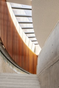 Hinter dem Altar gelangt man über eine geschwungene Treppe ins Untergeschoss, von dem aus ein unterirdischer Gang hinüber zum Nebengebäude führt. Das vierte Volumen der circa 3.900 Quadratmeter großen Anlage befindet sich hinter dem Kirchenschiff und dient als Gemeindehaus. Doch nicht nur Ort und formale Gestaltung schaffen einen Bezug zu den ikonischen Vorbildern der Moderne – in ihrer Projektbeschreibung zitieren die Architekt*innen Lúcio Costa, der vor dem Bau Brasílias vom weiten Horizont des Ortes begeistert war. Das ist auch dem Entwurf von ARQBR anzumerken. (mh)