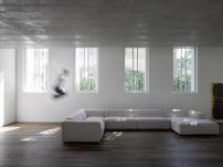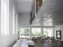 Die zuvor geschlossene Südfassade wurde zum Garten hin geöffnet, indem sie großflächige Schiebefenster und Balkone erhielt. Die schlichten hellen Innenräume sind minimalistisch gehalten und besitzen Loft-Charakter. Ausgefallen ist einzig die Badezimmereinrichtung: Wände, Boden und Decke schimmern in sattem Gold.
