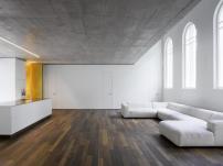 1924 errichtet, wurde das Kirchengebäude, wie die Architekten beklagen „in den 70er Jahren völlig verunstaltet“. Sie setzten jetzt zwei Wohnungen in die alten Mauern nach dem Prinzip einer Box in der Schale: „Um das Erdgeschoss stützenfrei zu halten und die großzügigen Kirchenfenster erhalten zu können, wurde die obere Wohnung als Betonkiste in den doppelgeschossigen ehemaligen Kirchenraum gehängt.“