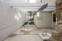 Ihre Strategie, mit dem baulichen Erbe umzugehen, umschreiben ALEAOLEA als einen „architektonischen Dialog“. Mit dieser Personifizierung der alten und neuen Bauelemente, die untereinander versuchen, ihren Geltungsanspruch zu verhandeln, versinnbildlichen sie ihr Wechselspiel zwischen Diskontinuität und Fortschreibung des Bestands. Einerseits reproduziert die neue, äußere Ziegelfassade die dichte, unregelmäßige Textur der alten Werksteine und stellt so eine visuelle Kontinuität her. Andererseits verstärkt die innere Fassade mit ihren weißen, perforierten Ziegelsteinen den Kontrast zu den Bestandelementen. (df)