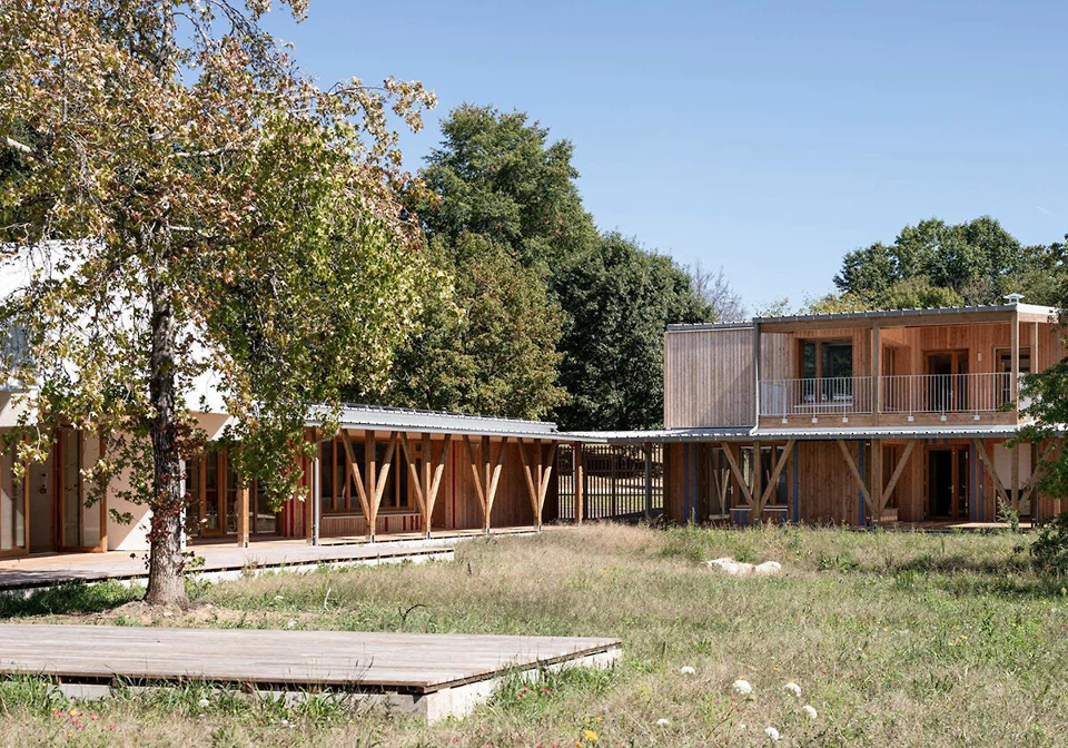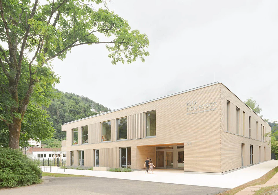 Die Große Kreisstadt Schramberg im mittleren Schwarzwald plant einen Schulcampus. Dafür lobte sie 2020 einen Wettbewerb aus, den das Stuttgarter Büro Kamm Architekten für sich entscheiden konnte. Ein erster Baustein am nördlichen Endpunkt des projektierten Campus wurde vor einem Jahr fertig. Es handelt sich um die Kindertagesstätte Don Bosco mit fünf Gruppen sowie einem Familienzentrum.