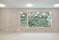 Wände, Decken, Böden und Einbaumöbel der Gruppenräume sind weiß gehalten, in den öffentlichen Bereichen findet sich auch Sichtbeton. Holzfenster und Möblierung wurden hell gebeizt. Neben dem sonnigen Gartenbereich gibt es im südlichen Teil des Gebäudes eine Spielterrasse im Obergeschoss.
