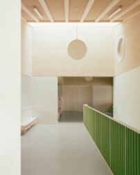 Im oberen Geschoss setzt sich die Raumstruktur fort, hier sorgen Oberlichter und kreisförmige Fenster in den Innenwänden für zusätzliche natürliche Beleuchtung. Birkenholz, weißer Putz und hellgrauer Gussbelag lassen den Innenraum ruhiger wirken als die Hülle und fördern die freundliche Lichtstimmung. Insgesamt wurden hier in fünf Jahren Bauzeit zwischen 2018 und 2023 etwa 2.120 Quadratmeter Bruttogeschossfläche errichtet. (tg)