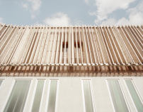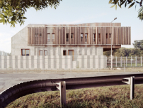 Diese schlichten Sichtbetonbauten mit den markanten Holzlamellen – für eine Wasseraufbereitungsanlage ein durchaus ungewöhnlicher Akzent – ergänzen den Altbestand. Außerdem: Die vertikale Verkleidung mit Lamellen und Fensterlaibungen aus Holz versperrt auch den Blick auf die Edelstahlrohre.