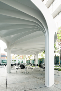 Vorgeschlagen und umgesetzt wurde von den Architekten ein organisch geformtes, weißes Stahldach mit Assoziationen an ein Blatt, das mit der strengen Geometrie und Materialisierung des Hofes kontrastieren möchte. Im Nordosten grenzt eine Spitze der Blattform an das Bestandsgebäude der Cafeteria, ohne es jedoch zu berühren. Die Lage der aufgefächerten schlanken Rippenstützen folgt der Form und Segmentierung des Daches, das im Verbund mit Dachrand und Rippen das Tragwerk bildet.