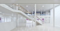 Der Zugang zum Haus erfolgt über einen neuen Haupteingang im Verbindungsbau. In den Geschossen über dem Eingangsbereich sind Untersuchungs- und Behandlungsräume untergebracht, im fünften Obergeschoss befinden sich sieben Operationsräume, die auf der gleichen Ebene wie auch die Säle im Bestandsbau liegen. Etwas ungewöhnlich ist die Erschließung der Untersuchungs- und Behandlungsräume. Die sind leicht zurückgesetzt, wodurch zusätzliche Korridore entstehen, dank derer sich die Wege verschiedener Nutzergruppen voneinander trennen lassen. Während Patient*innen und Angehörige durch einen Mittelgang geschleust werden, betreten die Ärzt*innen die Räume von der anderen Seite. Einzelbüros gibt es keine, da diese laut Analyse sowieso die meiste Zeit leer stünden. Statt dessen hat man pro Behandlungsgeschoss einen Open-Space eingerichtet.