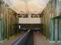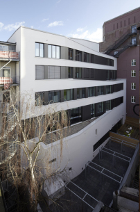 Im Inneren des Gebäudekomplexes setzt sich die polygonale Formensprache fort: In den Aufenthaltsbereichen im Erdgeschoss wurden die beiden Gebäudeteile durch gefaltete Brüstungsbänder und Lichtvouten verknüpft, und auch in den Erschließungszonen der oberen Geschosse sollen verschrägte Aufweitungen für räumliche Spannungen sorgen.