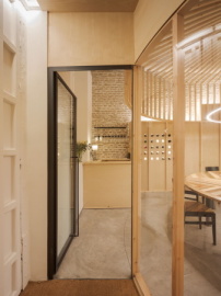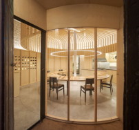 Das außergewöhnliche Setting in Form eines Raums im Raum, das Architektin María González und Architekt Juanjo López de la Cruz im Auftrag der Betreiber des Restaurants ConTenedor entworfen haben, lässt das 59 Quadratmeter große Erdgeschoss mit viereckiger Grundfläche zur Rotunde werden. Ihren Mittelpunkt bildet eine gusseiserne Säule, die sich bereits im Bestand befand und Sol89 als geometrischer Ausgangspunkt für einen Einbau aus Eschenholz diente. Innerhalb dieser schützenden Hülle, die alles Störende und Nebensächliche ausblendet, finden nun verschiedene Rituale des Kochens und Essens statt: Kurse, Dinner, Wein- und Olivenölverkostungen.