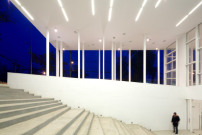 Die Nutzfläche von 1.425 Quadratmetern verteilt sich auf zwei oberirdische und zwei unterirdische Geschosse. Der Haupt-Versammlungsraum liegt unter dem „Amphitheater“, was ihm eine ausreichende Höhe und eine gute Akustik sichert. Um das Tageslicht möglichst weit ins Innere zu holen, sind die gesamten inneren Oberflächen weiß gehalten. Das Kulturzentrum stellt damit auch so etwas wie „ein weißes Blatt“ in der Stadt dar, das durch die Aktivitäten der Nutzer erst beschrieben werden soll. (-tze)