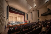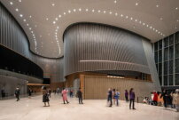 Im Inneren wird das Muster der Wellen, das sich übrigens auch in den Außenlagen wiederfindet, abermals weitergeführt. Besucher betreten das Gebäude durch eine große, hohe Lobby und gelangen über eine geschwungene Treppe, umrahmt von mit Holzlatten verkleideten, undulierenden Wänden, in das Foyer. Ein Restaurant befindet sich am Ende des abfallenden Volumens, das das Gebäude mit dem größeren Campus verbindet. Besonders deutlich wird das Wellenthema im Hauptsaal, der für opulente Opern- und Ballettaufführungen konzipiert wurde und 1500 Plätze bietet. Die mäandernden Wände betonen die organische Geometrie des Raums und optimieren die akustischen Bedingungen. Die Bühne besteht aus sechs doppelstöckigen Aufzügen, die bis zu zehn Metern angehoben und abgesenkt werden können. Ein Theater mit 600 Plätzen ergänzt den Hauptsaal. Dieser ist flexibel angelegt, Bühne und Bestuhlung können umgestellt werden, so dass unterschiedliche Aufführungen möglich sind. (dsm)