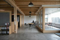 Während die Verkleidung der Fassaden im Außenraum nur wenig von den inneren Werten erkennen lässt, sind diese nach dem Betreten des Werkhauses deutlich ablesbar. Die hölzernen Stützen und Decken sorgen hier für einen warmen Kontrapunkt zu den mineralischen Böden. Offen verlegte Kabeltrassen geben den Räumen zugleich einen industriellen Akzent, der dann doch nicht allzu viel Heimeligkeit aufkommen lässt. (sb)