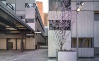 Der Anbau mit einem E-förmigen Grundriss besteht aus mehreren Teilen, die an ein bereits bestehendes Hochhaus anschließen. Die Verbindung zum Hauptvolumen erfolgt über eine breite Rampe. Von hier aus blickt man auf die mehrschichtige Fassade. Vor geriffelte Aluminiumblechwände haben die Architekten unterschiedlich große und ebenfalls profilierte, an Stahlstützen angebrachte Betonplatten gesetzt. Diese Bauteile sind mit opaken Glasfronten kombiniert – alles zusammen ergibt eine abwechslungsreiche Komposition in Grau.