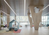Partielle Holzverkleidungen im Bereich der Terrasse und eines Balkons mit doppelter Höhe setzen einen kontrastierenden Akzent und markieren den Wohnbereich. Der Steifheit der äußeren Struktur entspreche eine große Lebendigkeit im Inneren des Gebäudes, erklärt Architekt Josep Lluís Mateo in einem Interview. Im Gegensatz zur äußeren Geschlossenheit habe man hier auf Transparenz gesetzt. Herzstück des Gebäudes ist eine Indoor-Plaza. (da)