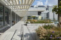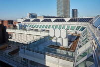 Die regulären Patientenbereiche und Zimmer liegen in den oberen Geschossen, wobei es hier mit teilweise Vierbettzimmern deutlich weniger luxuriös zugeht, als kürzlich in Winterthur. Ganz oben folgen dann noch anderthalb Geschosse für Privatpatient*innen. Ein kleiner Dachgarten steht aber allen offen, und auch im Innenraum gibt es weitere Bereiche für Patientinnen und Patienten, die den Aufenthalt angenehmer gestalten und damit die Heilung unterstützen sollen. (sb)
