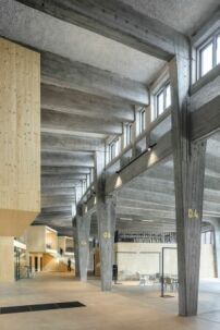 Der weitgehende Erhalt des Bestandes und die Holzmodul im Inneren minimieren die nötige Energie. Die opaken Bauteile wurden neu gedämmt. Hinter die Bestandsverglasung wurde eine neue Schicht mit Drei- oder Zweifachverglasung gesetzt. Im Sommer sorgt eine optimierte Nachtluftspülung mit Querlüftung durch die Fassade und Oberlichter für passive Kühlung. Hinzu kommen ein außen liegender Sonnenschutz sowie die Speichereffekte der nicht abgehängten Deckenbereiche und der Betonstützen. Die Fußböden dienen als Flächenheizung.