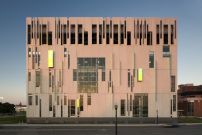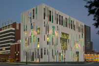 Den Zweck vieler Gebäude bekommt man nur indirekt serviert. So bei der neuen Kühlzentrale in Columbus, Ohio, die den medizinischen Campus der State University mit kaltem Wasser versorgt. Da so gut wie niemand das Gebäude je von innen sehen wird, wollte der Architekt Ross Barney (Chicago) zumindest den vorbeirasenden Autos etwas Besonderes bieten: Er hat die prominent gelegene Kühlzentrale als Aushängeschild der Universität positioniert. Aufgrund des engen Budgets ähnelt das Ergebnis allerdings eher einem raffiniert dekorierten Schuppen, der im wechselnden Licht dank vielfarbig abstehender Glasscheiben für etwas Abwechslung in der Stadtlandschaft sorgt.