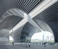Der Entwurf basiert auf einem quadratischen Feld, das in neun kleinere Quadrate mit je 70 x 70 Metern Grundfläche unterteilt ist. Das Bauensemble wiederum besteht aus sechs identischen, aber gegeneinander verdrehte Baukörper, die in zwei Dreierreihen angeordnet sind. Jeder einzelne Baukörper kragt über fast 40 Meter schirmförmig aus, erscheint als 50 Meter hoher Quader, der von zwei Seiten ausgehöhlt ist. Im obersten Geschoss finden sich auf fast 4.000 m² stützenfreie Ausstellungsräume und ein Sky Garden.