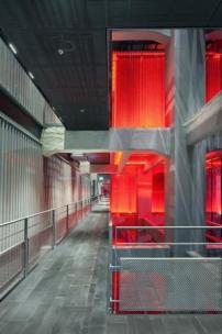 Alle Container verfügen über integrierte LEDs, mit denen die roten Wände im Zwischenraum zwischen Beton und Trapezblech von unten beleuchtet werden können. „Durch das gefilterte rote Licht wird dem harten industriellen Feeling des Gebäudes ein wärmeres Gefühl beigemischt“, so die Architekt*innen. „Die Lichtintensität ist deutlich stärker, wo die Container aus dem Haus ragen, während die Wände im Inneren der von Sedad Eldem vorgegebenen Struktur sanfter strahlen.“