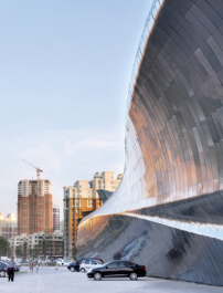 Auch das Innere des langen Museums-Blobs ist unregelmäßig geformt – nur Böden und Decken verlaufen gerade. Die kontinuierlich gekrümmten Wände sollen einzigartige Räume definieren. Der Neubau gliedert sich in zwei große Ausstellungshallen, die durch einen zentralen Eingangsbereich miteinander verbunden sind. Durch Dachöffnungen wird natürliches Licht in die neben den Ausstellungsbereichen angeordneten Lufträume geleitet, was für eine effektvolle Inszenierung der Exponate sorgen soll. Diese sind übrigens im Vergleich zu dem Neubau relativ unspektakulär. In dem glänzenden und fließenden Museum werden ganz einfache, chinesische Holzskulpturen ausgestellt.