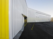 Schon aus der Ferne soll der Neubau auf seinen Inhalt verweisen: Die Einfahrt zum Parkplatz scheint mittels eines Laserstrahls präzise und scharfkantig aus dem Gesamtkörper herausgeschnitten worden zu sein. Die dabei entstandenen Schnittflächen wurden mit gelb beschichteten und teils gelochten Flachblechen bekleidet. „Dieser Farbe begegnet man in Kombination mit einem hellen Grau am und im gesamten Gebäude. Überall dort, wo im Innern geforscht wird, ist die Dämmung mit einer gelben Folie kaschiert, die zwischen der gelochten Metallfassade durchscheint. Auch der Eingangsbereich ist in die Kubatur eingeschnitten und, der Gestaltungslogik der Parkplatzeinfahrt folgend, gelb gestaltet“, erläutern die Architekten.