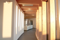 Auch die Konstruktion bezieht sich auf das historische Erbe der Region. Die umlaufende Holz-Glas-Fassade wird an der Außenseite durch vertikale Holzschwerter strukturiert, die zudem die nötige Verschattung gewährleisten.