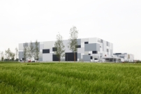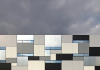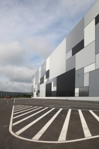Wie ein Mondrian in Graustufen wirken die in unterschiedlichen Größen und Proportionen angeordneten Fassadenbereiche in verschiedene Weiß- und Grautöne bis hin zu Schwarz. Metallisch-reflektierende Flächen in Edelstahl sowie verglaste Flächen zur Belichtung des Kommissionierbereich) ergänzen das Fassadenmuster, dessen reflektierende Oberflächen die Umgebung mit ihren Tages- und Jahreszeitenstimmungen spiegeln sollen. Neben den Spiegelungseffekten soll die Komposition aus unterschiedlichen Größen und das Spiel mit der Wirkung verschiedener Maßstäbe zu einer markanten Einbindung in die Umgebung, erhoffen sich die Erbauer.