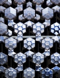 Die unterschiedlichen Formen der Kristalle, die unterschiedliche Behandlung ihrer Oberflächen (manche sind klar, manche matt und mit einem grafischen Muster bedruckt) sowie die Lücken, die hier und da im Raster gelassen wurden, lassen abstrakte, beinahe poetisch-verträumte Lichtspiele auf der Fassade entstehen.