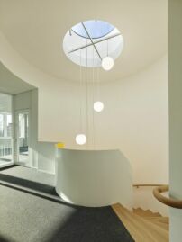 Auf tragende Wände haben die Architekt*innen im Gebäudeinneren weitestgehend verzichtet, sodass die Flächen in Zukunft an wechselnde Arbeitsbedingungen angepasst werden können. In den Innenräumen wechseln die brettergeschalten Sichtbetonoberflächen des Erschließungskerns mit hellen Decken und Wänden in den Büros sowie kräftigen gelben Akzenten, die sich durch das Haus ziehen. Erdsonden versorgen die Räume im Winter mit Wärme und temperieren im Sommer über eine passive Kühlung. Die Baukosten werden für die Kostengruppen 300 bis 500 mit rund 9,4 Millionen Euro netto angegeben. (sbm)