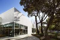 Ähnlich zurückhaltend sind auch die Fassaden der Baukörper, die auf den ersten Blick wie weißes Korbgeflecht wirken und erst auf den zweiten Blick erkennen lassen, dass sie, als Reverenz an den Inhaber, aus zigtausend kleinen Ts bestehen.