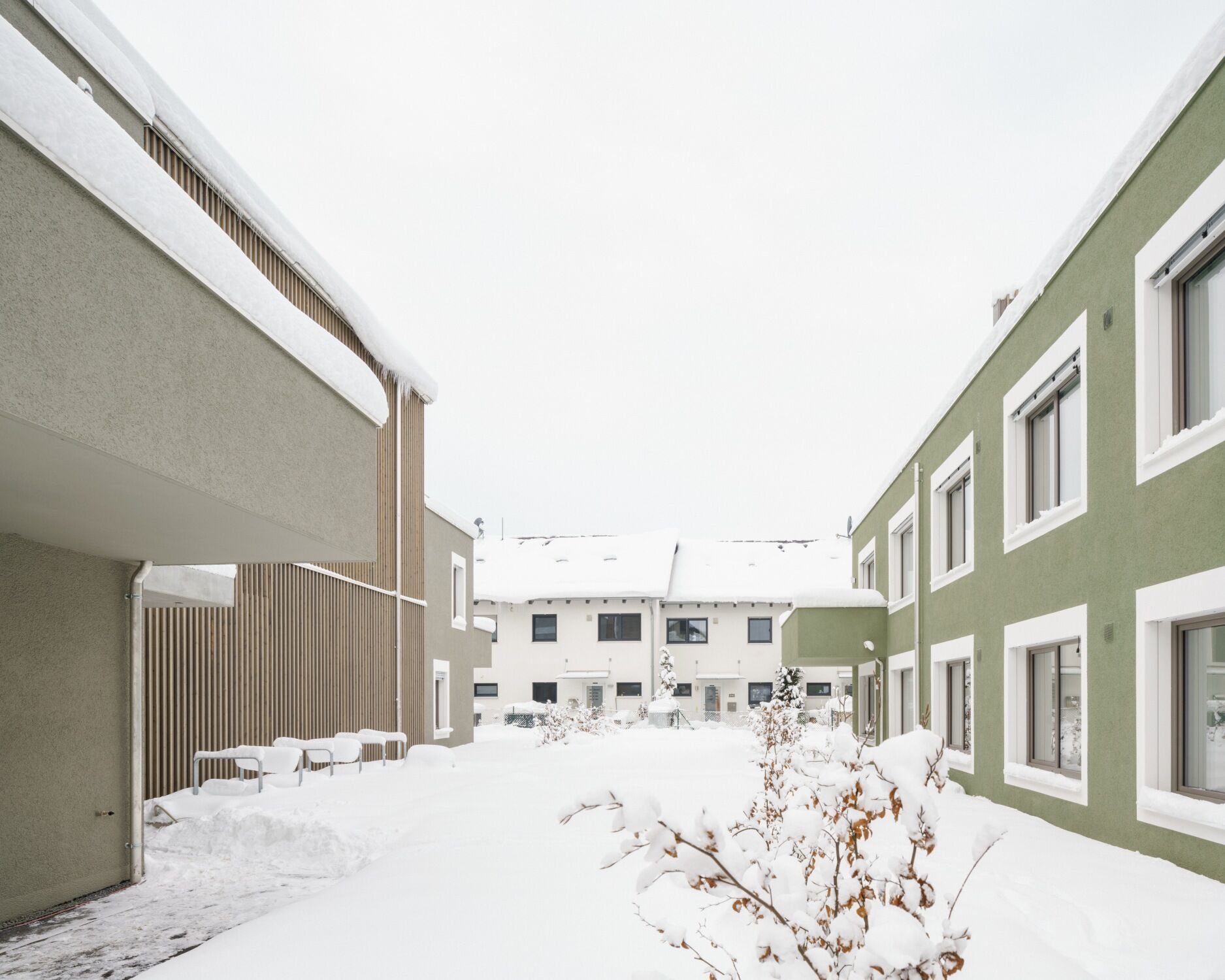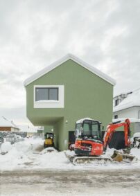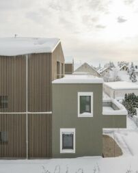 Während das nördliche Haus unter seinem auskragenden Obergeschoss die Zufahrt zu Grundstück und Tiefgarage aufnimmt, sind die drei baugleichen Häuser im Süden deutlich kompakter. Gestalterisch fällt neben den mit Holzlamellen verkleideten Giebeln vor allem die changierende Putzfarbe der unteren Geschosse auf – je Haus stuft sich die Fassade von einem knalligen Grasgrün zu einem gedeckten Beigegrün ab. Die schlichten weißen Putzfaschen sollen hierzu einen Kontrast setzen. Auf den Fotos scheint die winterliche Schneeschicht eine passende Ergänzung zu sein, indem sie auch der schmalen Attika zu mehr Präsenz verhilft. (tg)