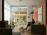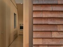 Levitt und Goodman beschäftigen sich schon länger mit dem Thema Nachverdichtung. Viele Bemühungen scheitern dabei nicht nur an restriktiven Bebauungsplänen, sondern auch an veralteten Regularien für Eigentumsgemeinschaften und der fehlenden Akzeptanz der Nachbarn für höhere Bauten. Neue Gesetze sollen dahingehend aber Verbesserung bringen. Und LGA fügen vor diesem Hintergrund ihr Volumen geschickt ein. Straßenseitig etwas niedriger proportioniert, steigt es rückwärtig an, um dann steil, aber leicht schräg abzufallen. Das rückwärtige Gartenhaus spiegelt diese Bewegung. Die Fassaden der beiden Bauten folgen der typischen Grammatik der Gegend: Straßenseitig kommen Terrakotta-Ziegel zum Einsatz, und im Garten Shou Sugi Ban-Holz.