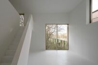 Die terrassierte Kubatur des Hauses mit rund 1.550 Quadratmeter Bruttogrundfläche ist gewissermaßen ein Produkt der Abstandsflächen. Zur Steigerung der Aufenthaltsqualität fügten die Architekt*innen weitere Vor- und Rücksprünge hinzu, die zu jeder Seite private Dachterrassen generieren. Kein Geschoss gleicht dem anderen. Großflächige Fenster in unterschiedlichen Formaten und Teilungen gewähren Einblick in die hohen, geweißten Innenräume, die dem Haus fast schon einen musealen Charakter verleihen. Konstruiert wurde in Stahlbeton.