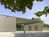 Das voluminöse Dach schafft nicht nur lichte Raumhöhen bis zu mehr als sieben Metern, sondern nimmt über den Umkleiden auch die Lüftungszentrale auf. So konnte man auf einen Keller verzichten. Außen verstehen die Architekt*innen das Dach als fünfte Fassade, weshalb es vollflächig mit aufgeständerten Lärchenholzleisten verschalt ist. Als wasserführende Schicht dient eine darunter liegende Metallfläche. (mh)
