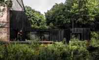 Die Architekten haben den Baukörper der Umgebung angepasst und teilweise in die Erde gegraben, damit er unterhalb des Straßenniveaus steht. Die dunkle Holzverkleidung spielt mit Licht und Schatten, sodass der Anbau im umgebenden Wald optisch zu verschwinden scheint.