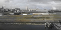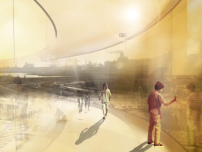 Auf dem Fundament eines verwaisten Industriebaus planen Moke, eine Black Box zu errichten. Ihr soll im oberen Stockwerk die Signatur des Baus aufgesetzt werden – ein gläserner Ring, dessen Panorama-Blick auf die Landschaft das touristische Highlight des Informationszentrums sein wird. Die Black Box sinkt eine Etage in die Böschung und bietet im Untergeschoss Platz für Tagungen, Konferenzen und andere Veranstaltungen. Ein Restaurant soll im Erdgeschoss eingerichtet werden, dessen Terrasse zugleich auf der Kuppe des Deichs liegen wird. Ein praktischer Umgang mit den Gegebenheiten und dazu ein gläserner Heiligenschein – mit diesem Vorschlag mussten Moke Architecten den Wettbewerb um das Informationszentrum wohl gewinnen. (sj)