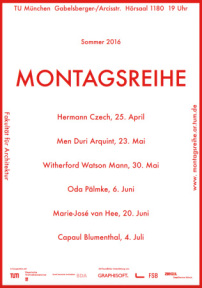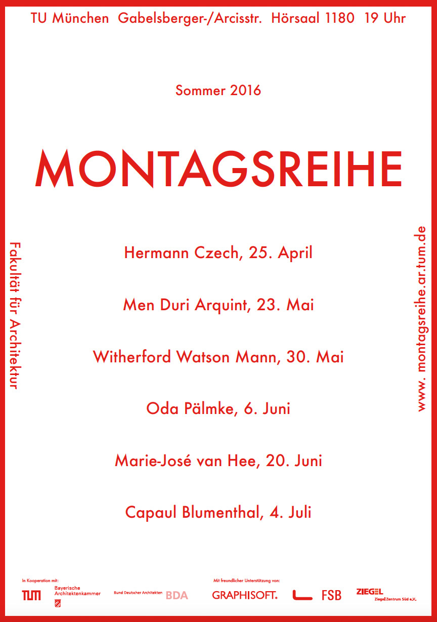 Sechs Vorträge, dann ist Juli. Den Start für die Montagsreihe an der TU München macht heute Hermann Czech. Der Wiener Architekt gilt als Protagonist einer stillen Architektur, die „nur spricht, wenn sie gefragt wird“ – diesen November wird er 80 Jahre alt. Mit Men Duri Arquint aus Chur folgt am 23. Mai eine wesentlich jüngere Position, aber durchaus von gleicher Lautstärke jenseits der Stararchitektur.