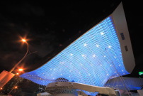 Dazu gehört auch das nigelnagelneue Markenzeichen des Kultur- und Kinozentrums, die spektakuläre Dachkonstruktion: Mit einer Spannweite von 85 Metern bei einer Dachfläche von 60 mal 120 Metern ist sie das weltweit größte auskragende Dach. Geplant wurde sie von den Frankfurter Tragwerksplanern Bollinger + Grohmann. Von unten spektakulär mit LEDs beleuchtet, rollt es wie ein architektonischer Tsunami über die darunter liegenden Räume hinweg. Dort finden sich allerdings nicht Verwüstung und Zerstörung, sondern 60.000 Quadratmeter für Performance-, Veranstaltungs-, Gastronomie-, Büro- und Verwaltungsräume. Insgesamt bietet der Komplex Platz für bis zu 6.800 Besucher.