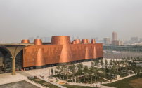 Die auffällige, in verschiedenen Kupfertönen changierende Außenhaut des Gebäudes besteht aus Aluminiumplatten. Perforierte Variationen eines kreisförmigen Ornaments strukturieren die Fassade, die zudem von zahlreichen, unregelmäßig verspringenden Bullaugenfenstern durchbrochen wird. Dieses perforierte Metallkleid reduziert Hitze und trägt so zur Energieeffizienz des Museums bei. Ähnlich wie die Kegel: Deren sich verjüngende Form hilft, warme Luft zu kanalisieren und sie je nach Jahreszeit nach draußen oder zurück in die Galerien zu leiten. Das zentrale Atrium fungiert dabei wie ein Solarkamin, der für eine konstante Luftströmung nach oben sorgt. (da)