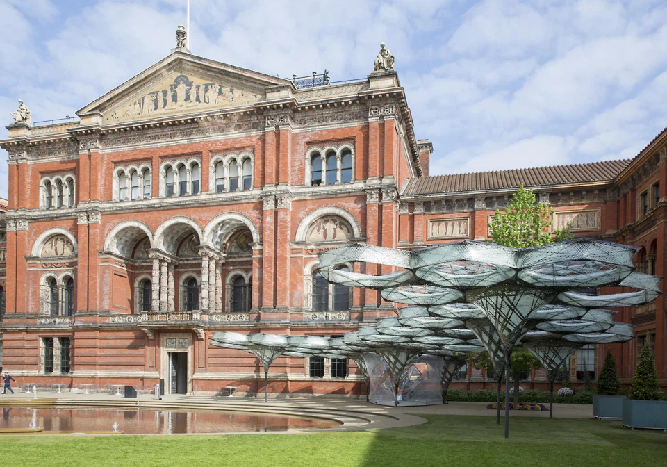 Also entwickelten die Architekt*innen eine frei geformte Hülle aus 479 individuell geformten Betonplatten, jede etwa zwei Meter hoch und bis zu 14 Meter lang. Die Eingänge sind wie Schlitze in das Kleid geschnitten. Die Färbung des Betons ähnelt Sandstein, die Platten hängen an einer Stahlstruktur. In die Platten ist ein Relief geschliffen, das an die V‘s und A‘s des Museumslogos erinnern darf. Alle Eingangsbereiche und Treppen befinden sich im Raum zwischen diesem äußeren Kleid und den Ausstellungsräumen. Am 18. April wird das Museum mit der Sonderausstellung The Music is Black: A British Story eröffnet. (fh)