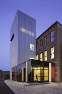Die Architekten ergänzten den Bestandsbau um einen gläsernen Anbau, der als Eingangslobby dient. Einen neuen Treppenaufgang verkleideten sie mit perforierten Metall Paneelen, die in ihrer Materialität an die industrielle Vergangenheit des ehemaligen Fabrikgebäudes erinnern. Die zur Straße ausgerichtete Schaufensterfront ist in verschiedenfarbigem Glas gestaltet und gewährt Passanten den Einblick in laufende Aufnahmen. So wollen die Architekten „einen Dialog zwischen Musikstudio und urbanem Raum“ schaffen. Probe- und Unterrichtsräume befinden sich im ersten Obergeschoss. Unterkünfte für Gastkünstler auf der zweiten Etage sowie ein ebenerdiges Café sollen dazu beitragen, dass sich das neue Kulturzentrum zu einer „24/7 - Community“ entwickle, so die Architekten.