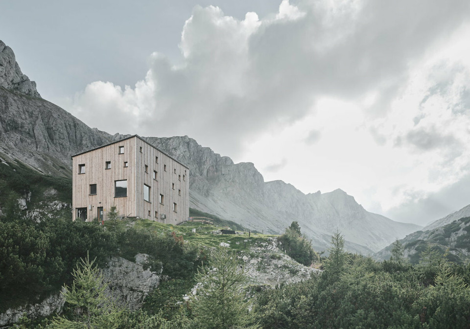 Bis heute spielen viele Architekt*innen beim Entwurf von Berghütten mit tradierten Motiven und urwüchsiger Materialästhetik. So finden grobe Steine, Cortenstahl und Sichtbeton Verwendung. Indes kommt dem traditionellen Material Holz nach wie vor eine wichtige Rolle zu, vor allem aus konstruktiven und logistischen Gründen. So werden vorgefertigte Elemente bequem per Hubschrauber in hochalpine Zonen gebracht, um sie in der naturgegeben sehr kurzen Bausaison rasch montieren zu können.
