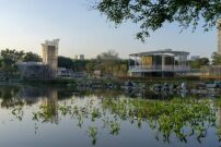 Eine Teichszenerie mit Lotusblumen, Zypressenwald und Silberreiherschwarm – der Honghu-Park in Shenzhens östlichem Stadtbezirk Luohu ist ein beliebter Erholungsort. Am nördlichen Ende der relativ schmalen, aber langen Grünzone wandeln die Besucher*innen nun nicht nur durch ein neu gestaltetes Stück Park, sondern zugleich über einer Wasseraufbereitungsanlage. Zu sehen ist von ihr außer ein paar Luftschächten und Aufbauten aber nicht viel, denn die technischen Einrichtungen befinden sich im Untergrund. Der oberirdische Teil dieses Projekts, eine etwa 3,2 Hektar umfassende Parklandschaft, wurde von NODE Architecture & Urbanism (Shenzhen) im Auftrag eines städtischen Wasserunternehmens geplant.