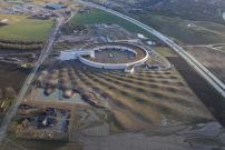 Außerhalb der 80.000-Einwohner-Stadt hat das Büro FOJAB arkitekter hier in der Provinz Skane Iän, die als reichste landwirtschaftliche Kulturlandschaft Schwedens gilt, einen riesigen, ringförmigen Baukörper gesetzt. Um die für das Labor benötigte thermische Stabilität zu sichern und die von der naheliegenden Autobahn ausgehende Bodenvibration zu minimieren, wurde Snøhetta mit der Entwicklung eines funktionalen Landschaftsparks rund um das Forschungszentrum beauftragt. Über eine Fläche von 19 Hektar legt sich das parametrisch generierte Landschaftsmuster, dessen Basis die auf dem Grundstück gemessenen Wellenlängen der Bodenvibration waren. Die vom Ring ausstrahlenden Landschaftshügel sollen sich in den kommenden Jahren in eine Weidelandschaft für Schafe verwandeln. Verschiede Gräser und andere Nutzpflanzen seien dafür in Zusammenarbeit mit Spezialisten des Schwedischen Landwirtschaftsinstituts in Alnarp ausgesucht worden. Die Hügel sind übrigens aus dem Erdaushub des Gebäudevolumens, der normalerweise abgetragen und wegtransportiert wird, aufgeschüttet worden. (lr)