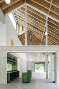 Die Architekt*innen entwickelten den Pavillon als kräftiges, wiedererkennbares Haus im Grünen. Unter einem hohen Satteldach liegt ein weiter, siebeneckiger Raum, der sich jederzeit in zwei robuste Mehrzweckräume teilen lässt. Nach Norden – zum Fußballstadion – liegen alle Nebenräume, nach Süden lässt sich der Pavillon über große Glastüren zum Park öffnen. Das Dach kragt rinnenlos nach Süden aus und schafft so geschützte Sitzbereiche auf der Terrasse zum Park. Im Inneren liegt das Holztragwerk des Satteldachs offen über dem Raum und öffnet sich nach Norden zu einem langen Dachfenster.