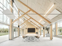 Für die leichte Konstruktion in Schwerte kamen unbehandeltes Vollholz für die Tragstruktur und für die Fassade regionales Kalamitätsholz, durch Borkenkäfer geschädigt, zum Einsatz. Deutlich zu erkennen ist die gestalterische Anlehnung an ein Gewächshaus, die sich insbesondere in dem fast vollständig verglasten, hallenartigen Raum wiederspiegelt. Der Innenraum stemme sich nicht gegen das Außenraumklima, schreiben die Architekt*innen. Vielmehr schaffe er einen Ort, der über das ganze Jahr im Austausch mit dem ihn umgebenden Klimagarten stehe.