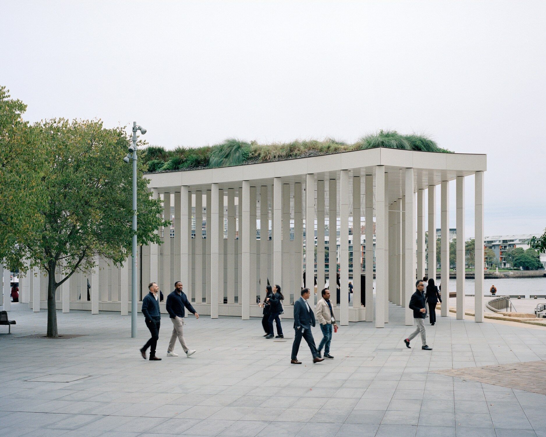 Die Grundrissform mit konkav geschwungenen Stützenreihen soll die Geometrie der Buchten und Halbinseln im Hafen Sydneys spiegeln. Auf den Stützen sitzt ein Dach aus Brettschichtholzträgern, dessen dichte Begrünung infolge seiner Neigung auch für Fußgänger*innen sichtbar ist. Lokale Pflanzenarten, Sandsteinblöcke und hohle Baumstämme sollen einheimische Vögel und Insekten anziehen. Die Deckenuntersicht sowie die Stützen und Wände verkleidet ein Terrazzo, den Besley & Spresser eigens für den Pavillon entwickelten und dessen Oberfläche die Konturen der darin verwendeten Austernschalen zeigt.